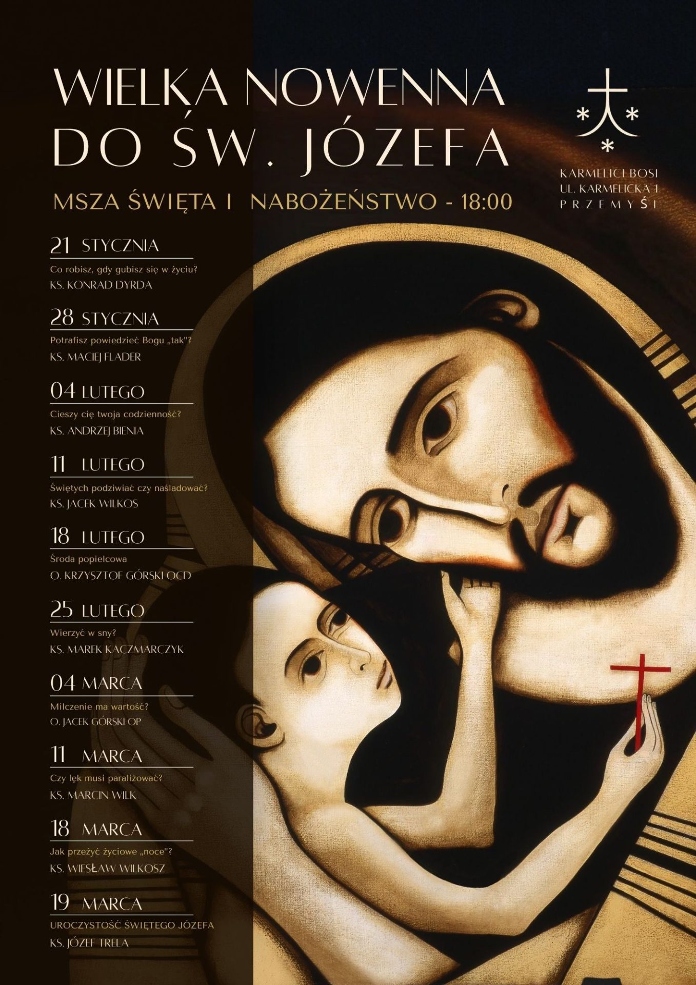 Ojcowie Karmelici z Przemyśla serdecznie i gorąco zapraszają na duchową wędrówkę zwaną „Wielką nowenną do św. Józefa”. Od środy 21 stycznia do środy 18 marca co tydzień na Karmelu Eucharystia ze słowem zaproszonych kaznodziejów oraz modlitwa do św. Józefa w intencjach pozostawionych w skrzynce przy obrazie Świętego.