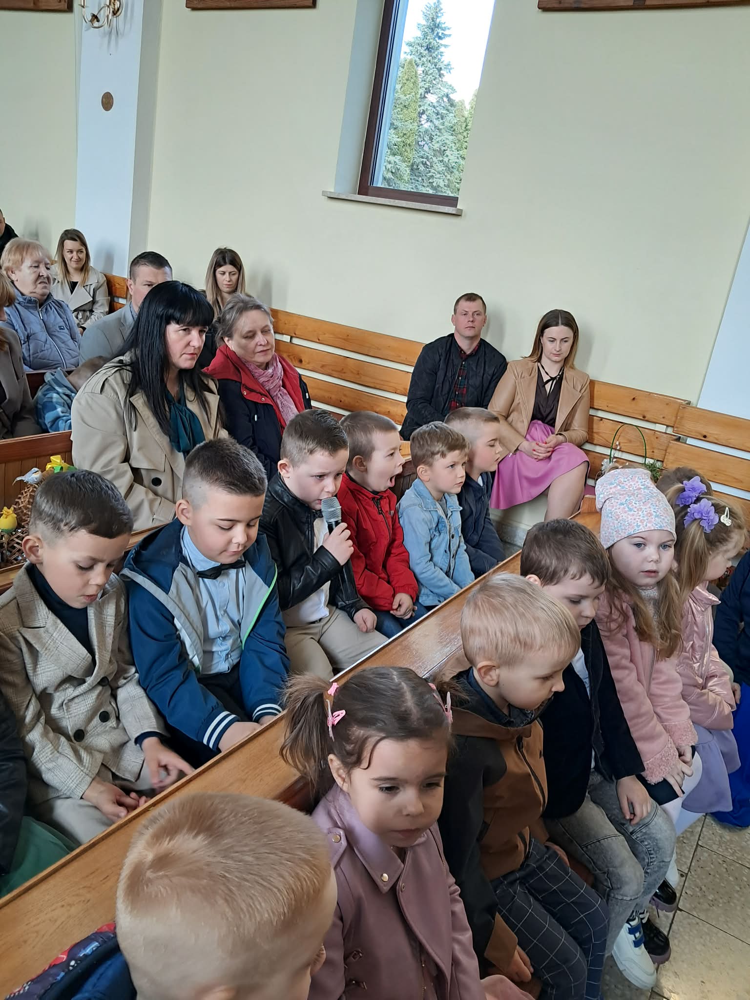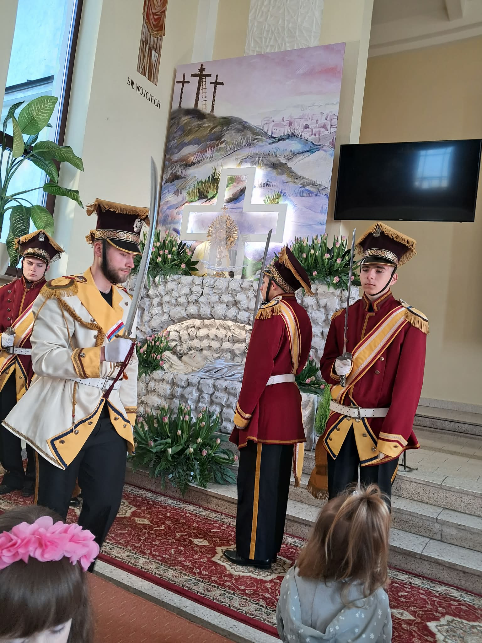 Wielka Sobota To szczególny dzień ciszy całego Kościoła, która ma nas wszystkich skoncentrować na grobie Chrystusa i przygotować na radość Zmartwychwstania. Nawiedzamy w tym dniu Grób Pański i czuwamy na modlitwie przed Jezusem obecnym w Najświętszym Sakramencie. Nie można tego dnia sprowadzić tylko do wizyty w kościele w celu poświęcenia pokarmów. Niech będzie ona okazją do osobistej modlitwy przed grobem Zbawiciela. Tak uczyniły Misie Pana z Ochronki w Kosienicach. Czuwały przy grobie Pana modląc się podczas adoracji wierszykami uwielbiając Boga. Następnie poświęciły pokarmy znajdujące się w koszyczkach.